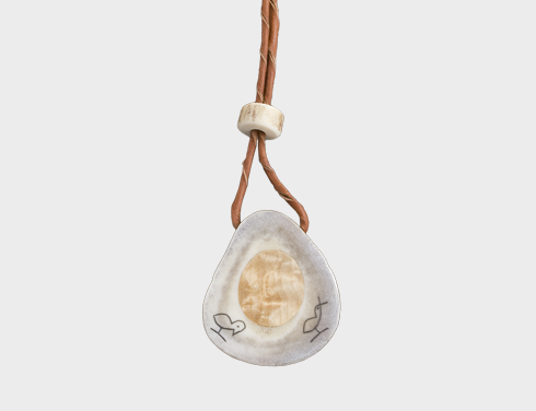Pendant is made of reindeer antler with inlay of curly birch or root gnarl. Old sámi symbol is engraved. Reindeer-leather string. Variety of colour and shape is natural for antler.