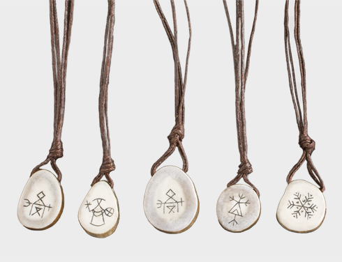 Pendant made of reindeer antler. Old sámi symbol engraved by hand. Approximately 50 cm long beeswaxed string. Button fastening. Variety of colour and shape is natural for antler.