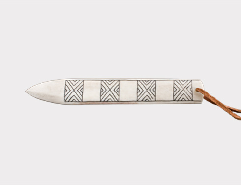 Made of reindeer-antler. Engraved by hand. Lenght approx. 12 cm. Originally meant for taking out inner bark of the pine tree. Natural variety of the colour of the horn.