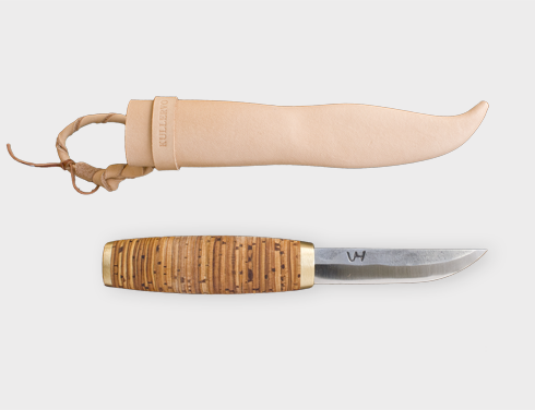 Kullervo knife is a product of blacksmith Veikko Hakkarainen. The handle is made of birch bark, the blade is carbon steel. Leather sheath.