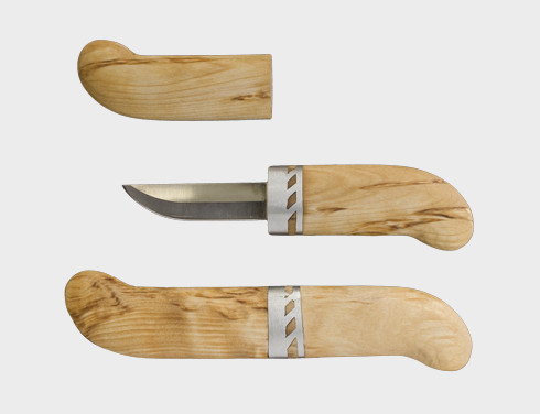 The blade is made of stainless steel. Tin ferrule. Handle and sheath made of curly birch or goat willow's root gnarl. Natural materials have a variety of colour.